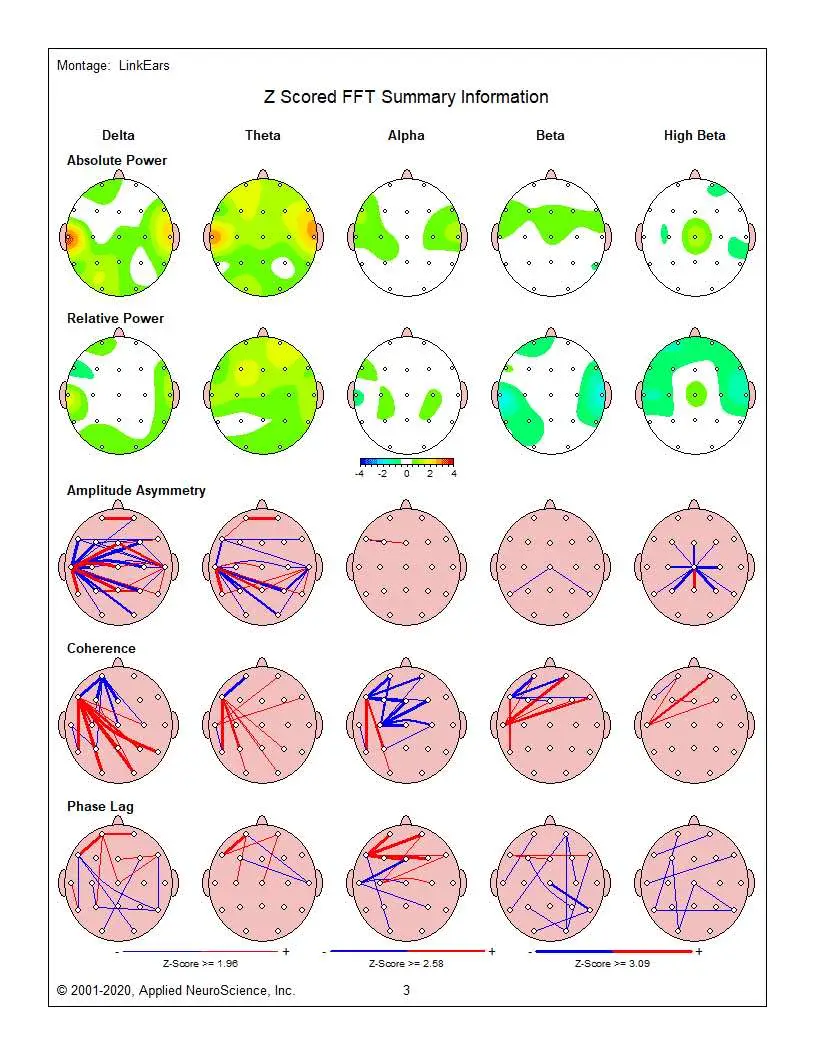 The activity in the Brain Control Centre area is significantly reduced. Please refer to the circle in the middle of the brain scan located in the Beta Frequency in Absolute Power, first row.